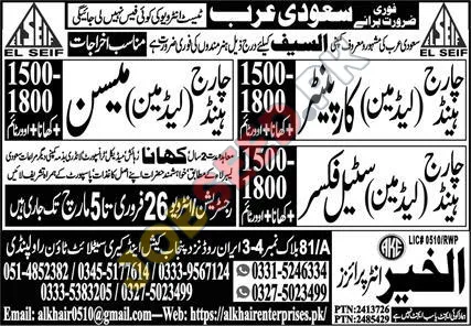 El Seif is urgently recruiting skilled Carpenters and Steel Fixers for its operations in Saudi Arabia. This is an excellent opportunity for people seeking jobs in the construction sector. The advertisement highlights the immediate need for skilled individuals, providing a competitive salary, meals, and overtime benefits, making it an attractive employment proposition.