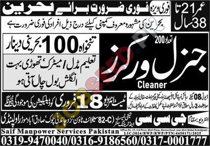 A reputable company in Bahrain is currently hiring for Cleaning positions. This is a chance to work abroad, offering a competitive salary of 100 Bahraini Dinars. Successful candidates will need a Matric qualification and the ability to speak basic English. Additionally, Cleaner jobs Rawalpindi are available for qualified candidates. This job offers a real chance for the applicant to improve professional growth