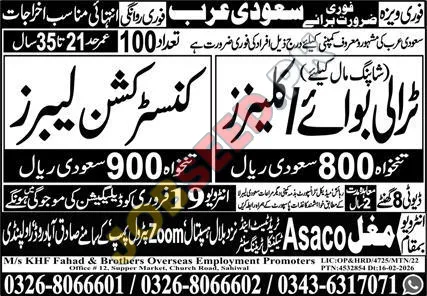 KHF Fahad & Brothers Overseas Employment Promoters are urgently recruiting for Construction Labourers and Trolley Boys for a prominent company in Saudi Arabia. This is an excellent opportunity for individuals seeking immediate employment with competitive salaries. This private sector job drive aims to find suitable candidates. Take the next step by applying for this career opportunity!