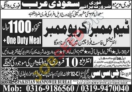 Immediate Hiring for Crew Members in Saudi Arabia