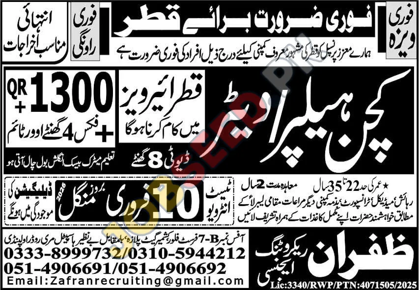 Zafran Recruiting Agency is looking for experienced Kitchen Helpers to join the team in Qatar. This is an urgent hiring situation with visa, and suitable expenses. This private sector opportunity offers a fixed 4-hour overtime work, with an 8-hour duty schedule, and requires basic English speaking skills. Candidates up to 35 years old are encouraged to apply. This direct hiring will offer a competitive salary of QR 1300 per month plus benefits to the right candidate.