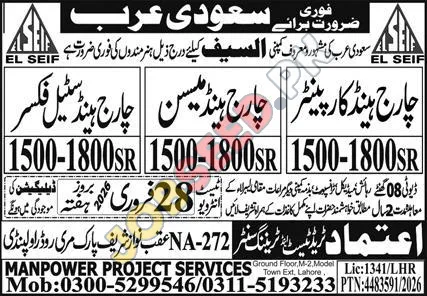 A well-known company in Saudi Arabia, Al-Seif, is urgently seeking skilled professionals in various construction trades. This represents a valuable opportunity for individuals looking for employment and career growth in the construction sector. The advertisement is looking for Carpenters, Masons, and Steel Fixers. These positions provide competitive salaries and offer the chance to work in a dynamic environment, contributing to significant projects within Saudi Arabia.