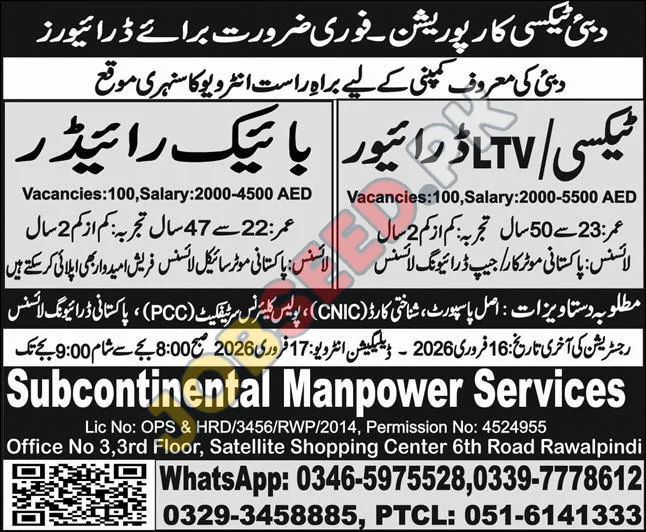Subcontinental Manpower Services is offering immediate employment opportunities for experienced drivers with a well-known Dubai-based taxi company. The latest job openings are available for both Taxi and Bike Riders. This is an excellent chance to join a reputable organization and earn a competitive salary.
