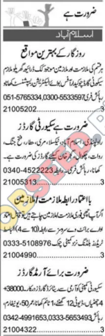 This advertisement highlights urgent job openings in Islamabad for security personnel and support staff. The organization is committed to providing a stable work environment and opportunities for professional growth. Explore these competitive salary with competitive benefits. Ideal candidates will find this a valuable prospect for securing a fulfilling career in the private sector.