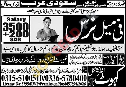 Private sector company in Saudi Arabia has announced urgent openings for female nurses, offering competitive salaries and benefits. The requirements includes certificate, a minimum of two years of experience. This recruitment is part of the organization's growth plan. Apply now for immediate consideration.