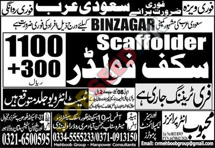 A leading manpower consultant firm is urgently seeking skilled Scaffolders for placement in Saudi Arabia with a competitive salary. This is your opportunity to join a renowned company, Binzagar, and work in a dynamic environment. The roles offer excellent benefits and the chance for professional growth and career development.