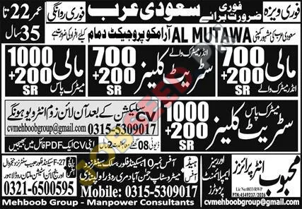 AL MUTAWA, a well-known company, is looking for skilled Cleaners to join their Aramco project team in Dammam, Saudi Arabia. Offering attractive compensation, these positions are open to qualified candidates from Pakistan. Don't miss this chance to take your career to the next level in a thriving sector.