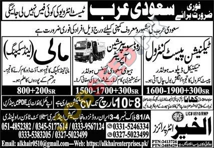 Urgent hiring announced by a reputable Saudi Arabian firm for skilled professionals. This position represents excellent career development in the region. Seeking Technician positions with specific focus in Pest Control and Road Sweeper roles. This is an exciting opportunity to advance your career.
