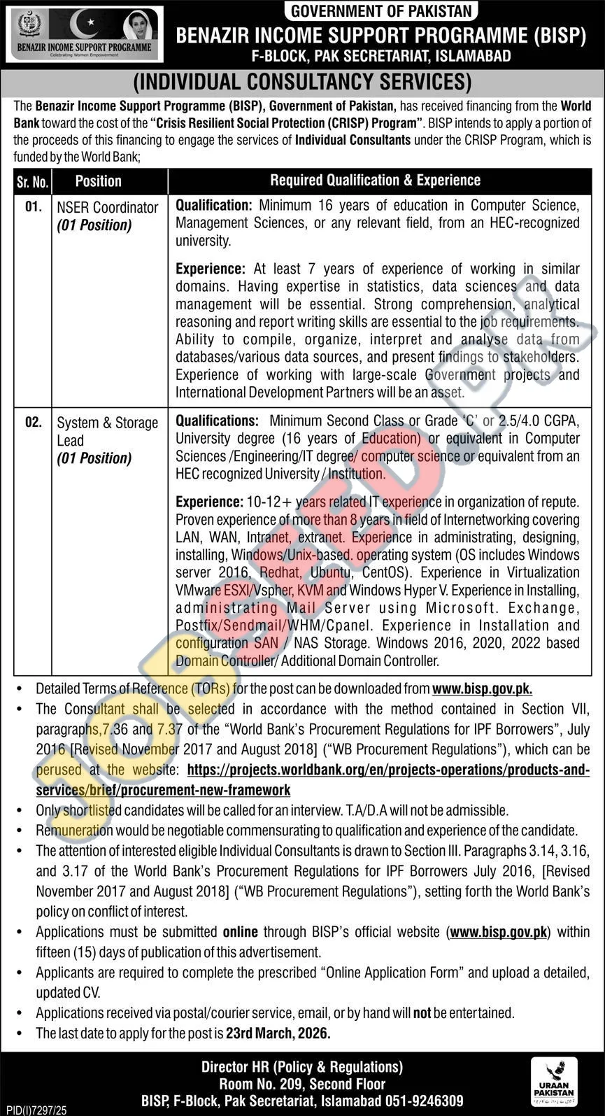 The Benazir Income Support Programme (BISP), a government entity under the Government of Pakistan, is actively recruiting for Individual Consultancy Services. These vacancies are related to the Crisis Resilient Social Protection (CRISP) Program, which is funded by the World Bank. These are great employment opportunities for qualified professionals. Apply now for valuable career growth. We are looking for talented candidates to join our team.