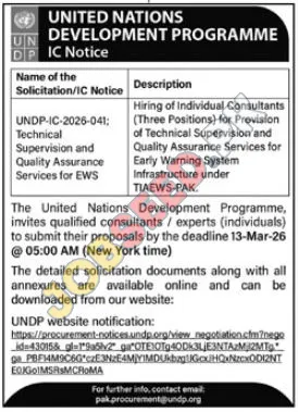 The United Nations Development Programme (UNDP) is announcing exciting career opportunities for highly skilled professionals to serve as Individual Consultants. These positions are critical for the provision of Technical Supervision and Quality Assurance Services for the Early Warning System infrastructure under the TIAEWS-PAK initiative. This is a unique chance to contribute to a vital international development project and gain valuable experience within a reputable global organization.