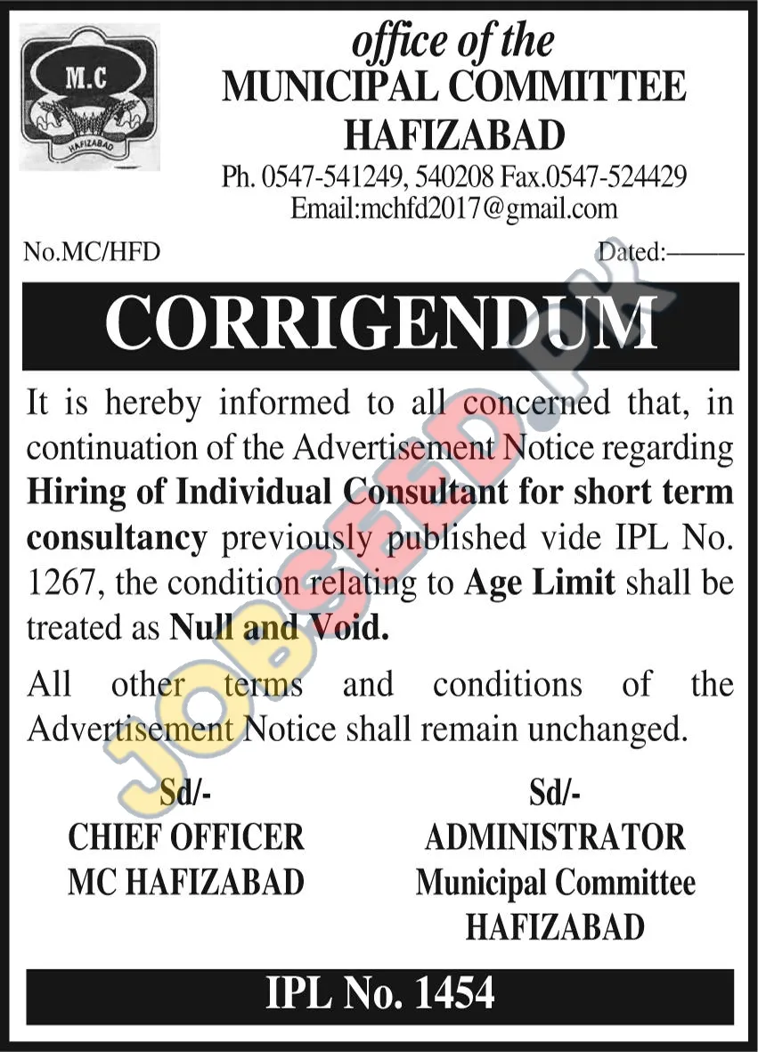 The Municipal Committee Hafizabad has released a corrigendum for the Individual Consultant position. Additionally, professional growth are available for qualified candidates. This update removes the age limit requirement for the short-term consultancy role, previously advertised under IPL No. 1267. This government job opening in Hafizabad, Pakistan, offers a chance for experienced professionals to contribute to public sector projects. The notice clarifies that all other terms and conditions of the original advertisement remain valid. Additionally, job openings are available for qualified candidates.