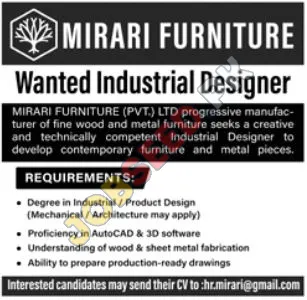 Mirari Furniture (Pvt.) Ltd, a distinguished private sector entity renowned for its exquisite wood and metal furniture, is extending an invitation for a creative and technically adept Industrial Designer to join its dynamic team. This pivotal role is designed for an individual passionate about shaping the future of furniture and metal product aesthetics and functionality.