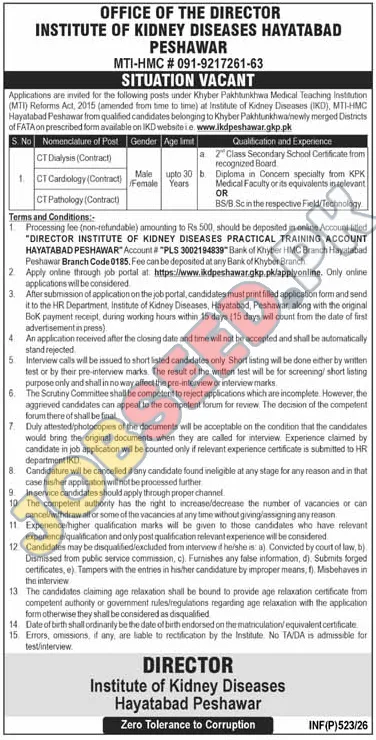 - Step 3: Submit Hard Copy 📝 After completing the online application, print the filled application form. Send this printed form along with the original payment receipt of the processing fee to the HR Department, Institute of Kidney Diseases, Hayatabad, Peshawar. This submission must be completed within 15 days from the date of the first advertisement in the press.
