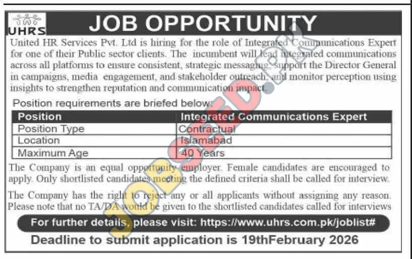 United HR Services Pvt. Ltd. is actively seeking a skilled Integrated Communications Expert to join a prominent public sector organization. This role is crucial for developing and executing comprehensive communication strategies across various platforms, ensuring consistent messaging, and enhancing stakeholder engagement. The ideal candidate will support the Director General in media outreach and monitor public perception to bolster the organization's reputation and communication effectiveness. This is a fantastic opportunity for professionals looking for impactful career development in government communications.