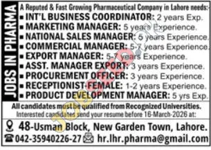 Explore career opportunities in Lahore with a reputable, fast-growing pharmaceutical company. We are recruiting for International Business Coordinator roles, along with various management positions including Marketing Manager, National Sales Manager, Commercial Manager, Export Manager, Asst. Manager Export, Procurement Officer, Receptionist (Female), and Product Development Manager. Candidates must hold qualifications from recognized universities. This private sector organization offers a stimulating work environment and pathways for career advancement. Apply now to join our dedicated team and contribute to our continued success in the pharmaceutical industry.