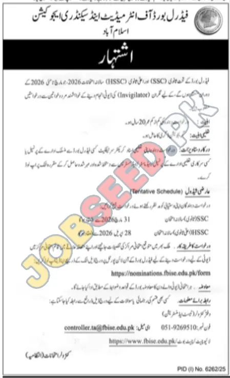 The Federal Board of Intermediate and Secondary Education (FBISE) is hiring Invigilators for the upcoming SSC and HSSC examinations in 2026. This is a temporary position with career opportunities within the education sector.
