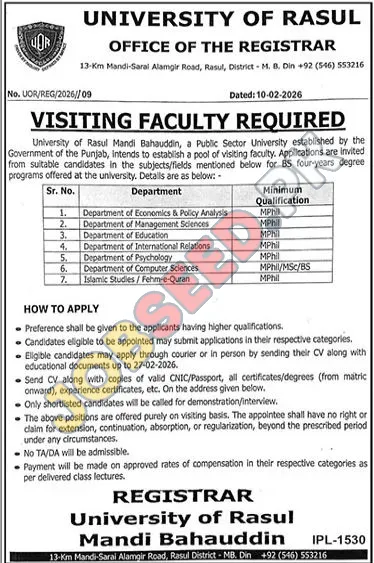 The University of Rasul in Mandi Bahauddin, under the Government of Punjab, is offering multiple Visiting Faculty positions. Ideal candidates will have relevant qualifications in areas such as Economics, Management Sciences, and Computer Sciences. These are excellent career opportunities for experienced professionals. Apply before the deadline.