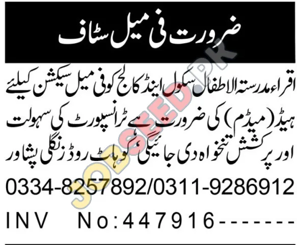 Iqra Madrassa Tul Atfal School & College, Peshawar Khyber Pakhtunkhwa KPK Pakistan invites applications from eligible candidates for the post of Female Staff and Head (Madam) as per advertisement of 12 December, 2025, published in Aaj Newspaper. Intermediate, Master educational qualification will be preferred.