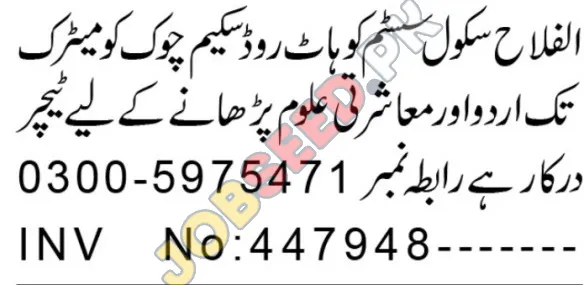 Al-Falah School System is seeking a dedicated and qualified Lecturer to teach Urdu and Social Sciences up to the Matric level. This role offers the opportunity to shape young minds and contribute to a positive learning environment within our established institution.