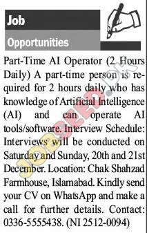 IT Company, Islamabad Islamabad Pakistan invites applications from eligible candidates for the post of Part-Time AI Operator as per advertisement of 18 December, 2025. Bachelor educational qualification will be preferred.