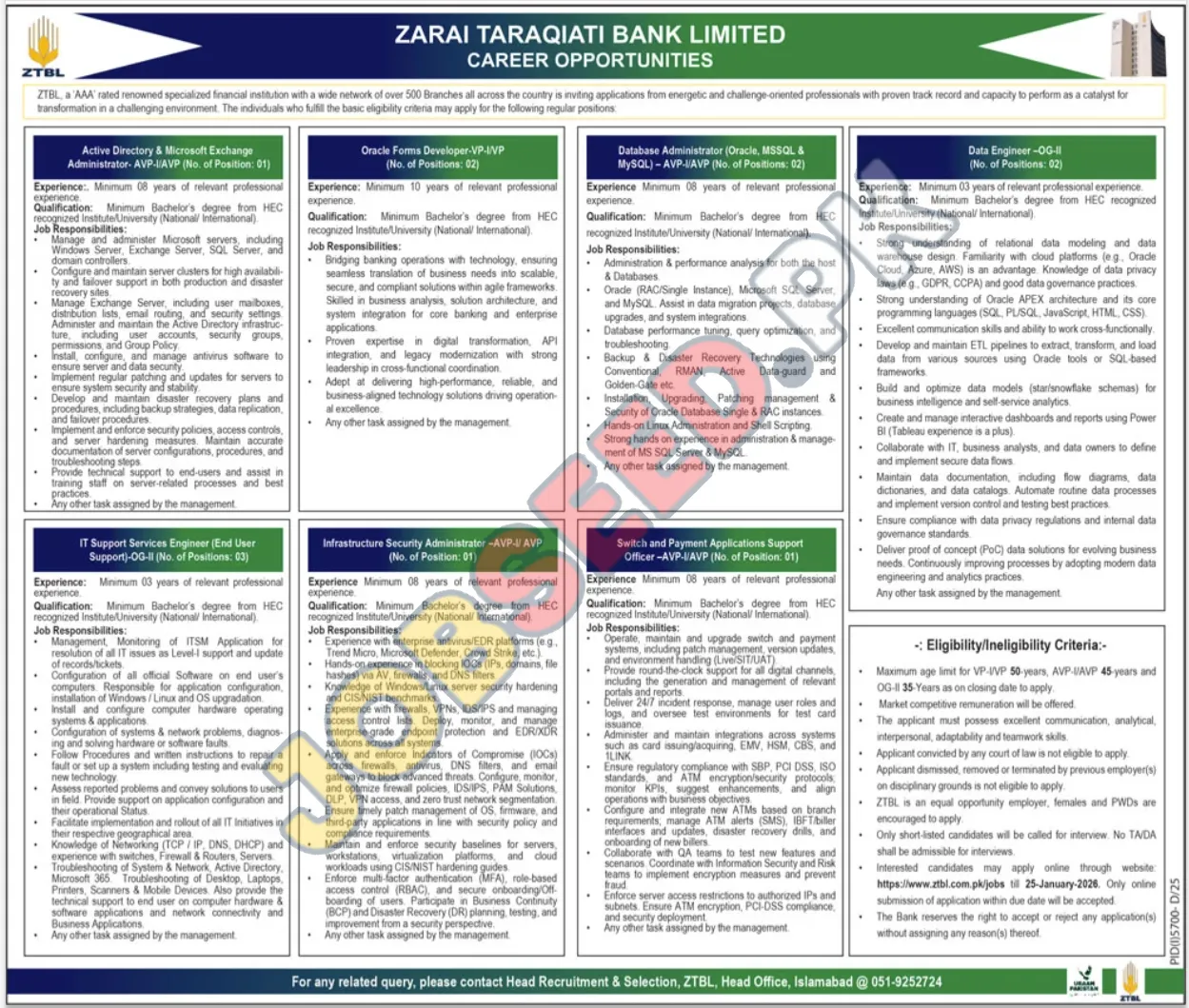 Zarai Taraqiati Bank Limited, Islamabad invites applications from eligible candidates for the post of Active Directory & Microsoft Exchange Administrator, Oracle Forms Developer, Database Administrator (Oracle, MSSQL & MySQL), Data Engineer, IT Support Services Engineer (End User Support), Infrastructure Security Administrator and Switch and Payment Applications Support Officer as per advertisement of 11 January, 2026. BA educational qualification will be preferred.