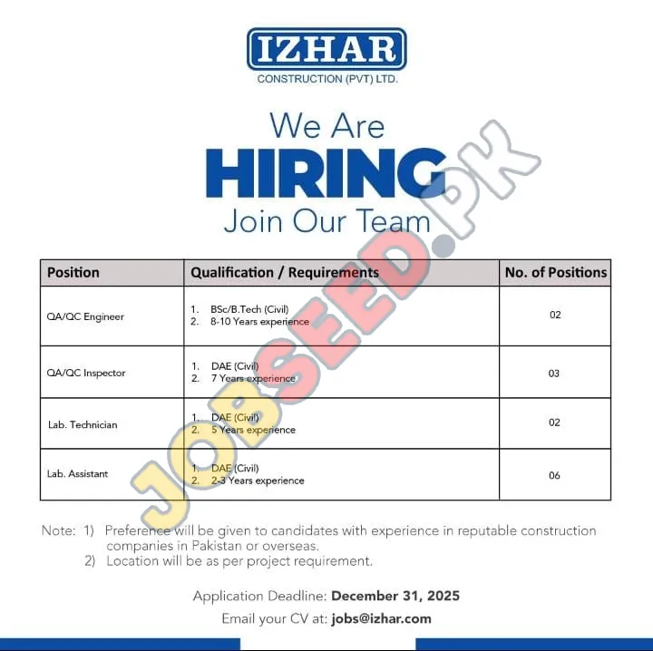 IZHAR CONSTRUCTION (PVT) LTD., Lahore invites applications from eligible candidates for the post of QA/QC Engineer, QA/QC Inspector, Lab Technician and Lab Assistant as per advertisement of 22 December, 2025. BA, Diploma educational qualification will be preferred.