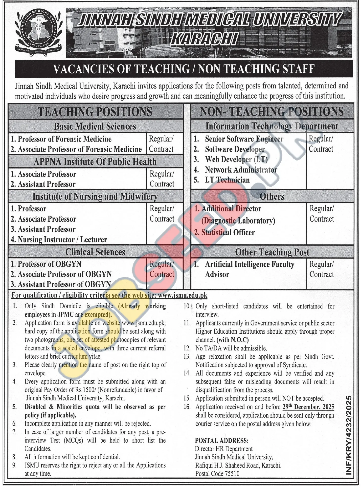 Apply at Jinnah Sindh Medical University, latest jobs in Education department before closing date which is around 29 December, 2025 or as per closing date in newspaper ad. Read complete ad online to know how to apply on latest Jinnah Sindh Medical University job opportunities. For Further details visit https://www.jobseed.pk.