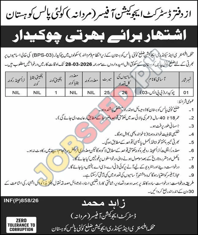 The District Education Office (Male) Kohistan is inviting applications for Chowkidar positions within the schools under its jurisdiction. This recruitment drive is exclusively for residents of Kohistan. Additionally, latest recruitment are available for qualified candidates. The selected individuals will play a vital role in ensuring the security of the schools. This is a chance to secure government employment and contribute to the education sector. Apply now to be part of an esteemed government organization.