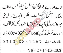 A well-established organization is looking for skilled female staff for its new office location. Exciting job opportunities are available for Office Assistants, Floor Incharges, Trainees, Supervisors, Tele Operators, Team Coordinators and other positions. This is a great opportunity for individuals seeking career growth and development in a professional environment. These openings offer competitive salary packages ranging from 40 to 60 thousand. Apply now and take the next step in your career with one of the leading private organizations.