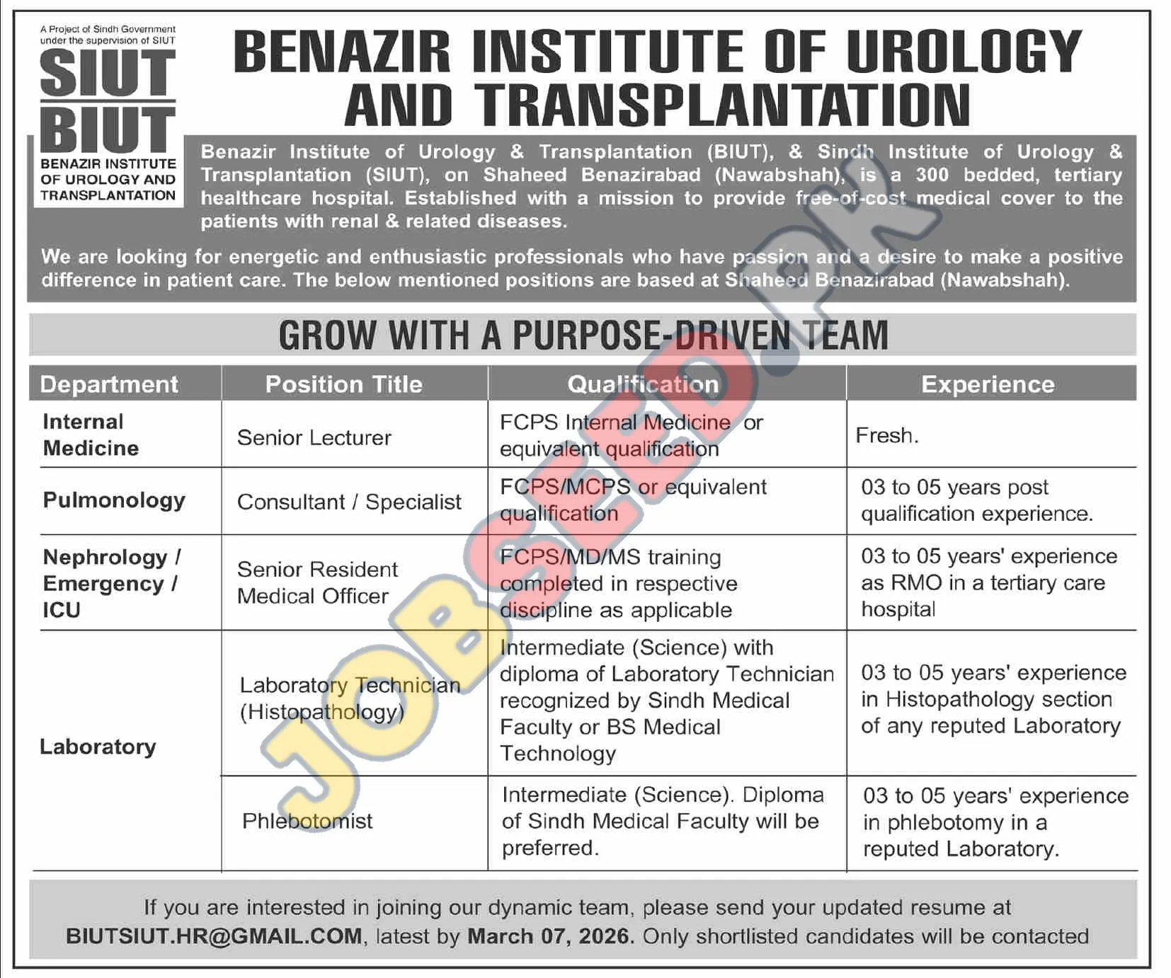 Benazir Institute of Urology & Transplantation (BIUT), a project of the Sindh Government, is hiring for various medical positions. Additionally, vacancies are available for qualified candidates. This government organization is committed to providing free-of-cost medical cover for renal and related diseases. We are seeking energetic and enthusiastic professionals for roles including Senior Lecturer, Consultant/Specialist, Senior Resident Medical Officer, Laboratory Technician (Histopathology), and Phlebotomist. These positions are based in Shaheed Benazirabad (Nawabshah), Sindh, Pakistan. Ideal candidates will possess relevant qualifications and experience in their respective fields, contributing to our mission of exceptional patient care and professional growth within the public health sector.