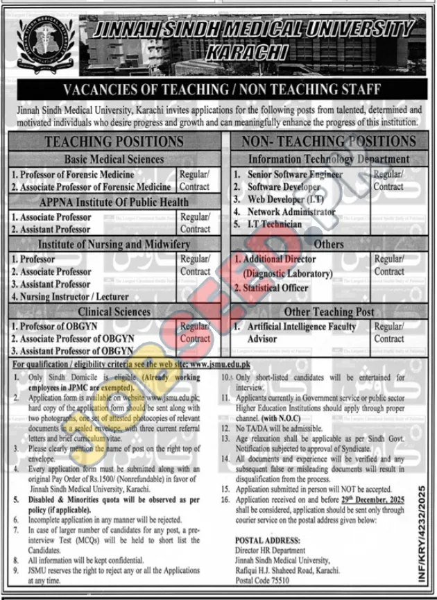 Jinnah Sindh Medical University, Karachi, is seeking talented individuals for teaching and non-teaching positions. Aspiring candidates can contribute to the progress of this institution. Here's a brief overview of the available opportunities!