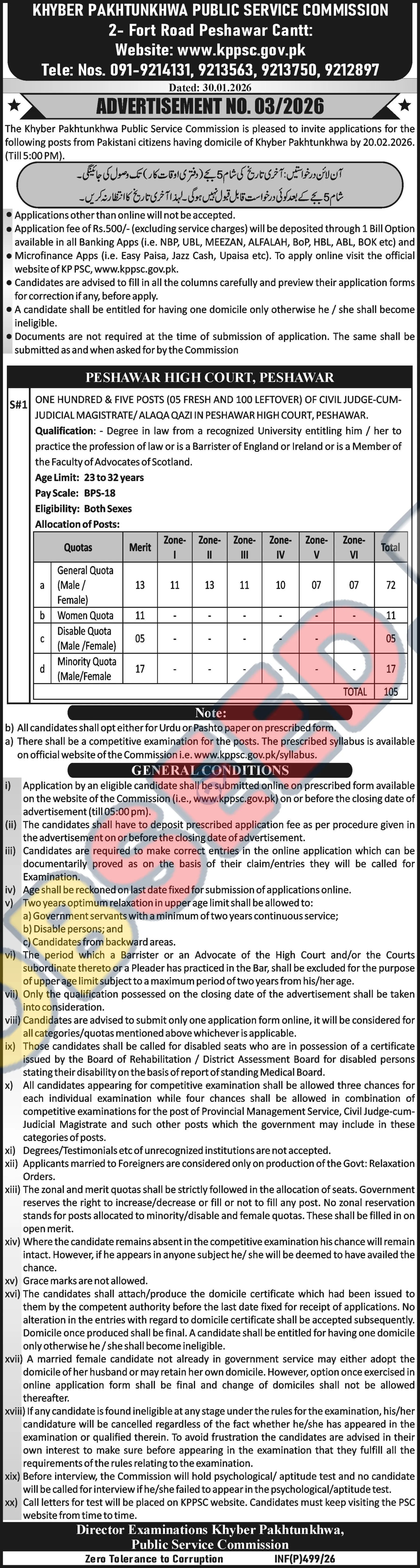The Khyber Pakhtunkhwa Public Service Commission (KPPSC) has announced significant career opportunities for legal professionals. The commission is seeking highly qualified candidates for the prestigious position of Civil Judge-cum-Judicial Magistrate in Peshawar. This government sector role offers a competitive salary package (BPS-18) and a chance to contribute to the judicial system. Applicants must hold a recognized law degree and meet specific eligibility criteria to apply for these judicial services vacancies. This recruitment drive aims to fill 105 positions, including both fresh and leftover vacancies, at the Peshawar High Court. Interested candidates should review the detailed requirements and apply online before the deadline.