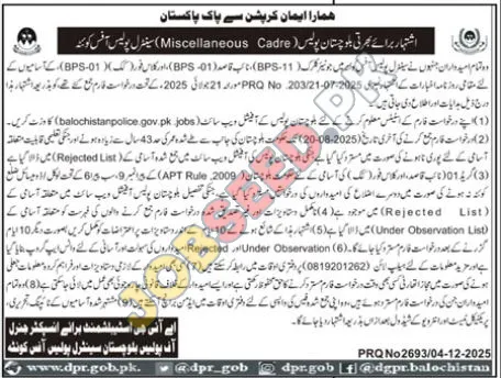 The Central Police Office Quetta has announced a recruitment drive for various positions within the Balochistan Police (Miscellaneous Cadre). This recruitment is for Junior Clerk (BPS-11), Naib Qasid (BPS-01), and Class IV (BPS-01). Candidates who had previously submitted application forms against advertisement No. PRQ 203/21-07-2025 dated July 21, 2025, are advised to take note of the following instructions.