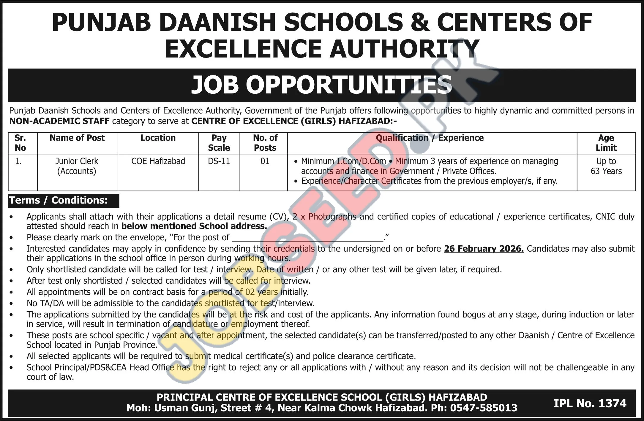 The Punjab Danish Schools and Centers of Excellence Authority is offering a significant career opportunity for individuals seeking stable employment within the public sector. A vacancy for a Junior Clerk (Accounts) is announced at the Centre of Excellence (Girls) in Hafizabad. This role is ideal for candidates with a strong commercial background and a desire to contribute to the educational infrastructure of Punjab.