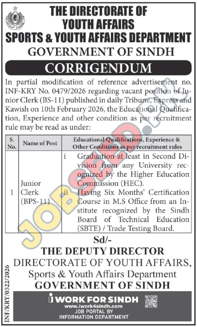 The Directorate of Youth Affairs, Sports & Youth Affairs Department, Government of Sindh, has issued a corrigendum regarding reference advertisement no. Explore these Latest Government of Sindh careers with competitive benefits. INF-KRY No. 0479/2026. This announcement highlights new career opportunities for qualified individuals seeking public sector employment. The department is actively recruiting for the position of Junior Clerk (BPS-11), offering a stable and promising career path within the Sindh government.