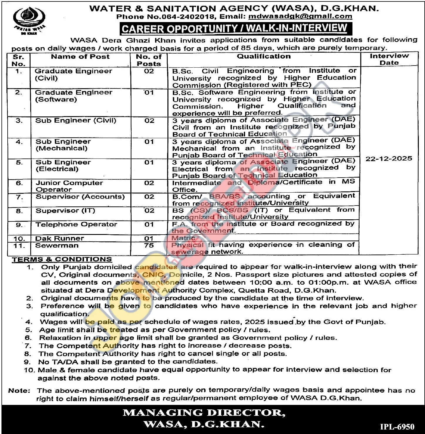 The Water and Sanitation Agency (WASA) Dera Ghazi Khan is conducting walk-in interviews for several positions on a daily wage/work charged basis for a period of 85 days. These positions are purely temporary. This is an excellent opportunity for individuals seeking short-term employment in various fields.