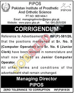 Junior Computer Operator Opportunity at Pakistan Institute of Prosthetic and Orthotic Science (PIPOS)