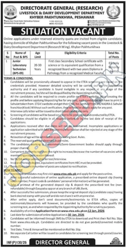 Directorate General (Research) Livestock & Dairy Development Department Khyber Pakhtunkhwa, Peshawar invites applications from eligible candidates for the post of Junior Laboratory Technician as per advertisement of 10 January, 2026. Master educational qualification will be preferred.