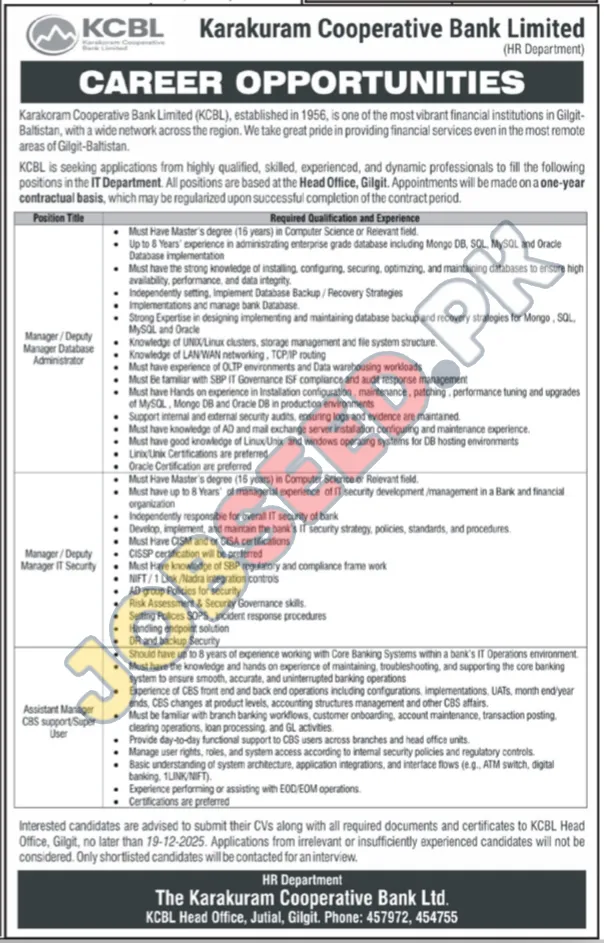 Karakuram Cooperative Bank Limited, Gilgit Gilgit Baltistan Pakistan invites applications from eligible candidates for the post of Manager/Deputy Manager Database Administrator, Manager/Deputy Manager IT Security and Assistant Manager CBS support/Super User as per advertisement of 05 December, 2025. Master, Bachelor educational qualification will be preferred.
