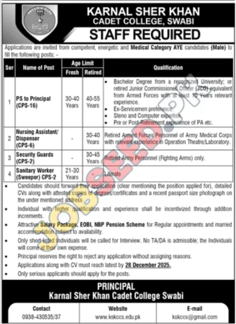 Karnal Sher Khan Cadet College Swabi, Swabi Khyber Pakhtunkhwa KPK Pakistan invites applications from eligible candidates for the post of PS to Principal, Nursing Assistant/Dispenser, Security Guards and Sanitary Worker (Sweeper) as per advertisement of 14 December, 2025, published in Jang Newspaper. Bachelor, Diploma, Matric, Literate educational qualification will be preferred.