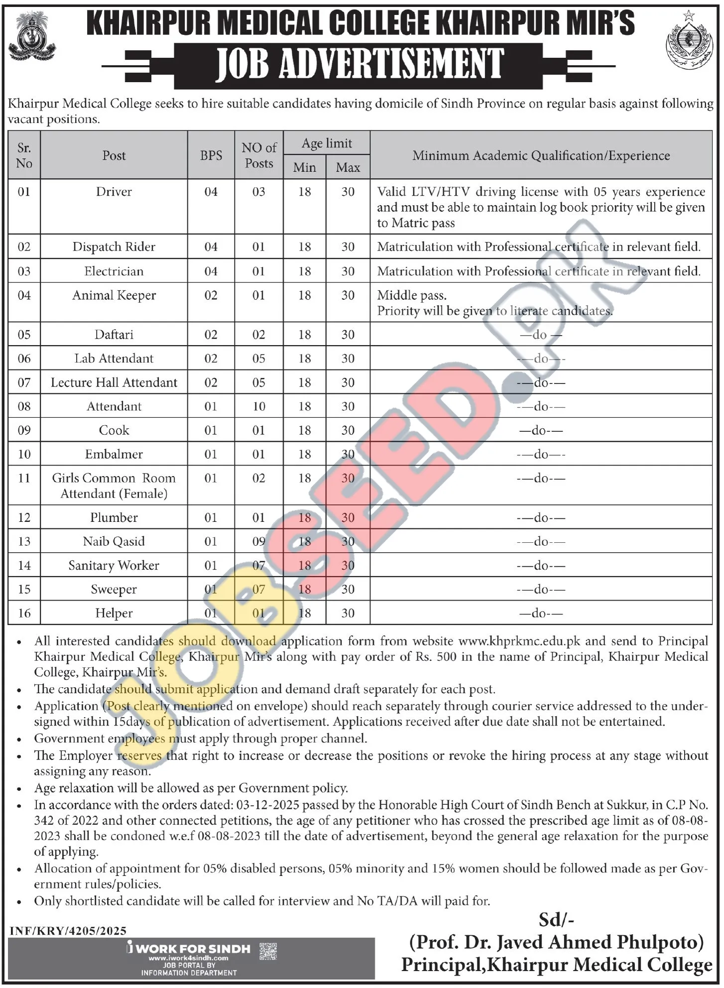 Khairpur Medical College, Khairpur Sindh Pakistan invites applications from eligible candidates for the post of Driver, Dispatch Rider, Electrician, Animal Keeper, Daftari, Lab Attendant, Lecture Hall Attendant, Attendant, Cook, Embalmer, Girls Common Room Attendant, Plumber, Naib Qasid, Sanitary Worker, Sweeper and Helper as per advertisement of 13 December, 2025, published in Tribune Newspaper. Matric, Middle, Literate educational qualification will be preferred.
