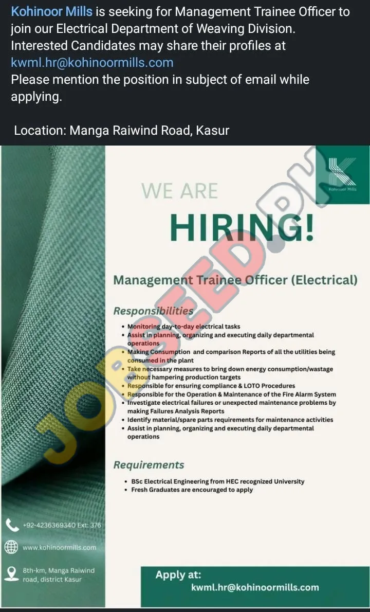 Kohinoor Mills is currently hiring a Management Trainee Officer (Electrical) to join their Electrical Department within the Weaving Division. This is a fantastic opportunity for fresh graduates seeking entry-level positions and career opportunities within a leading textile manufacturing company. Successful candidates will benefit from these Electrical Engineer jobs Kasur. We encourage all qualified candidates to apply and become a part of our dynamic team and contribute to our continued success. Ensure to send your applications to the provided email address and follow all listed instructions.