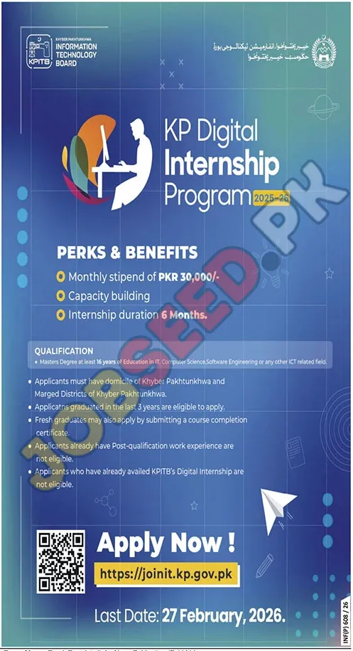 The Khyber Pakhtunkhwa Information Technology Board (KPITB) is launching its Digital Internship Program for the 2025-26 period, providing a unique government sector opportunity for aspiring IT professionals. This program focuses on practical skill enhancement and career advancement within the Information Technology domain. Eligible candidates will benefit from a monthly stipend and dedicated capacity building sessions. Ideal for individuals looking for entry-level IT roles and government employment in Pakistan.