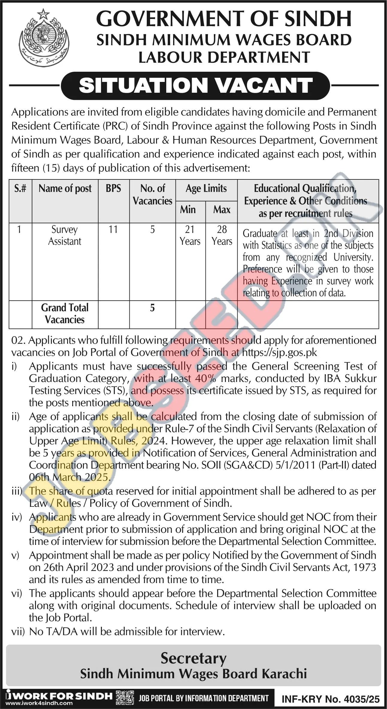 The Sindh Minimum Wages Board, Labour & Human Resources Department, Government of Sindh, is seeking qualified candidates for the position of Survey Assistant. This is an excellent opportunity to contribute to the important work of the Board within the Sindh province.