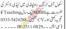 Career opportunity at Nursing School located in Rawalpindi Punjab Pakistan for the position of Lady Doctor / Lecturer. This employment notice was announced on 01 December, 2025 through Jang Newspaper. Candidates possessing a MBBS degree are encouraged to submit their application.