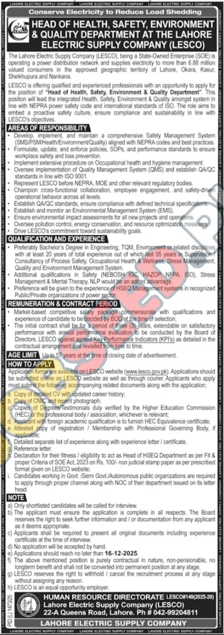 Lahore Electric Supply Company LESCO, Lahore Punjab Pakistan invites applications from eligible candidates for the post of Head of Health, Safety, Environment & Quality Department as per advertisement of 30 November, 2025. Bachelor educational qualification will be preferred.