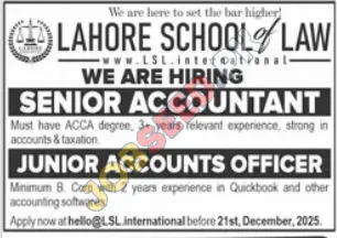 Join the team at Lahore School of Law LSL in Lahore, Punjab. They are seeking to hire 2 qualified individuals for the roles of Senior Accountant and Junior Accounts Officer. This is a Full-Time position. This career opportunity was advertised on 14 December, 2025 in Jang Newspaper. The last date to apply is 21 December, 2025. Don't miss this chance to advance your career with Lahore School of Law LSL. For more information and to apply online, visit https://www.jobseed.pk.