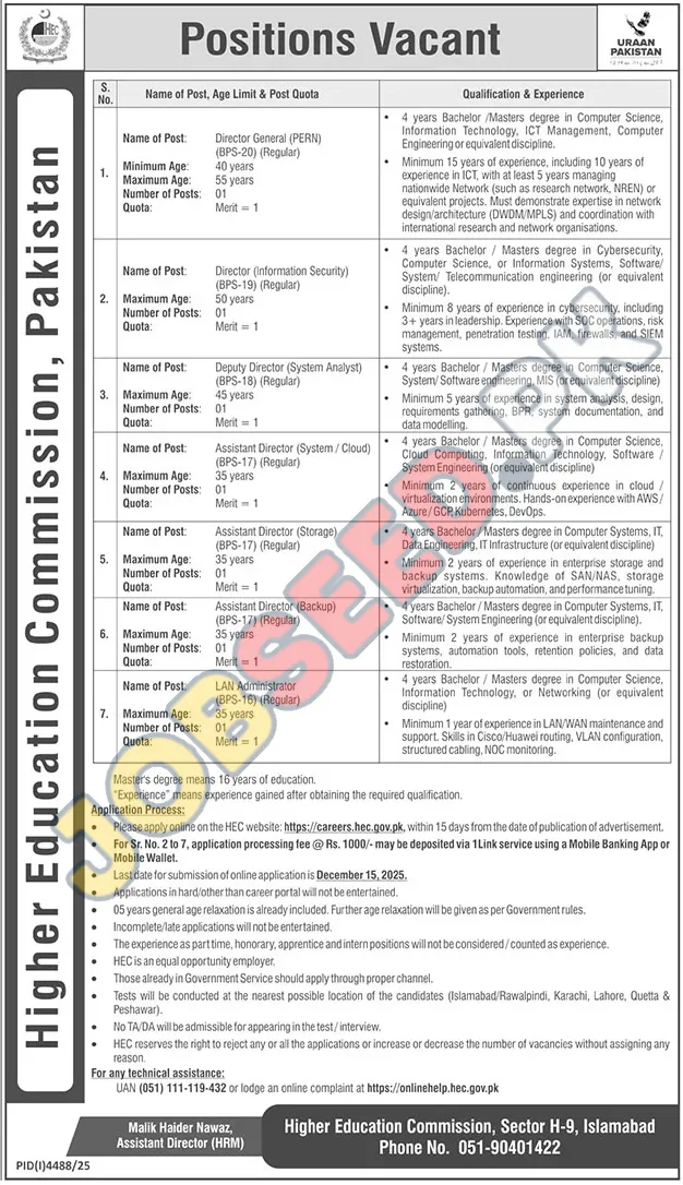 The Higher Education Commission, Pakistan is seeking qualified and experienced individuals to fill several key positions. These roles offer opportunities to contribute significantly to the development and management of higher education and technology infrastructure across the country. Applications are being accepted online until December 15, 2025.