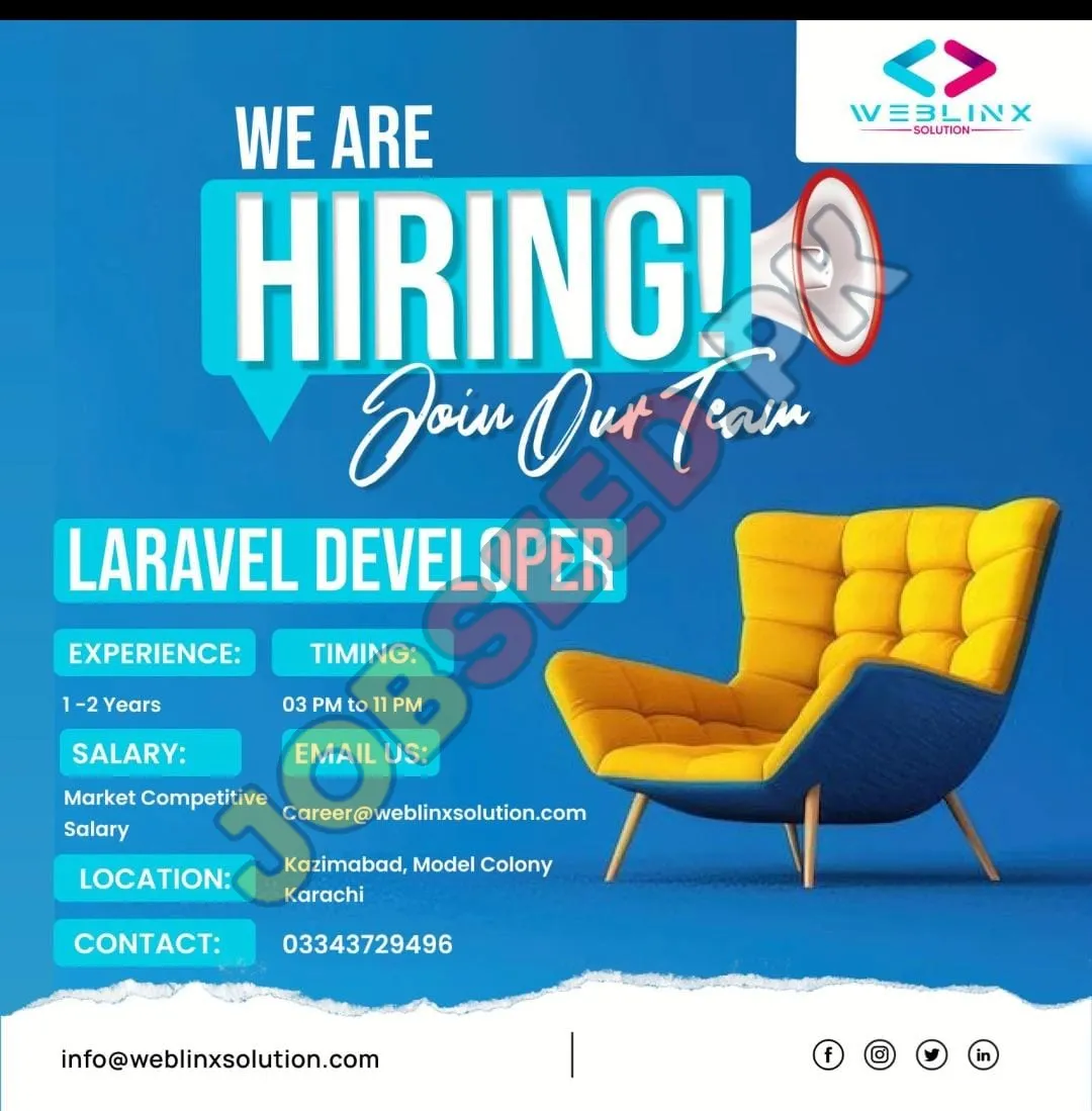 Weblinx Solution is actively hiring a Laravel Developer to join our dynamic team. Additionally, latest recruitment are available for qualified candidates. This is a fantastic opportunity for individuals seeking career opportunities and professional growth in the field of web development. As a Laravel Developer, you will contribute to the development of innovative solutions. We offer a competitive salary and a supportive work environment that promotes career development.