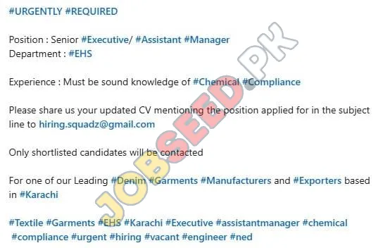 Leading Denim Garments Manufacturer, Karachi invites applications from eligible candidates for the post of Senior Executive and Assistant Manager as per advertisement of 04 December, 2025, published in Online Job Board. BA educational qualification will be preferred.